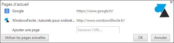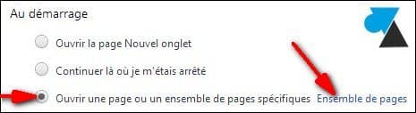- Pour choisir la page affichée à l’ouverture de Chrome, sélectionnez Ouvrir une page spécifique ou un ensemble de pages. Cliquez ensuite sur Ensemble de pages pour saisir les adresses souhaitées. Validez en cliquant sur OK.