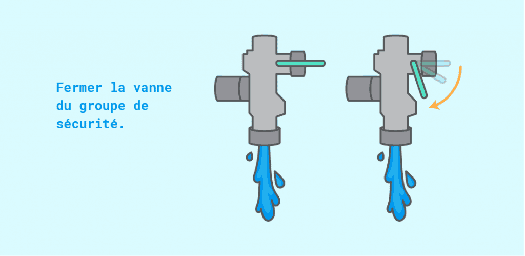 Pour stopper l’arrivée d’eau, actionnez le levier du groupe de sécurité. Si ce dispositif reste bloqué ou s’avère défaillant, coupez l’eau directement au compteur général. Ensuite seulement, vous pouvez procéder à la vidange du chauffe-eau, en toute tranquillité.