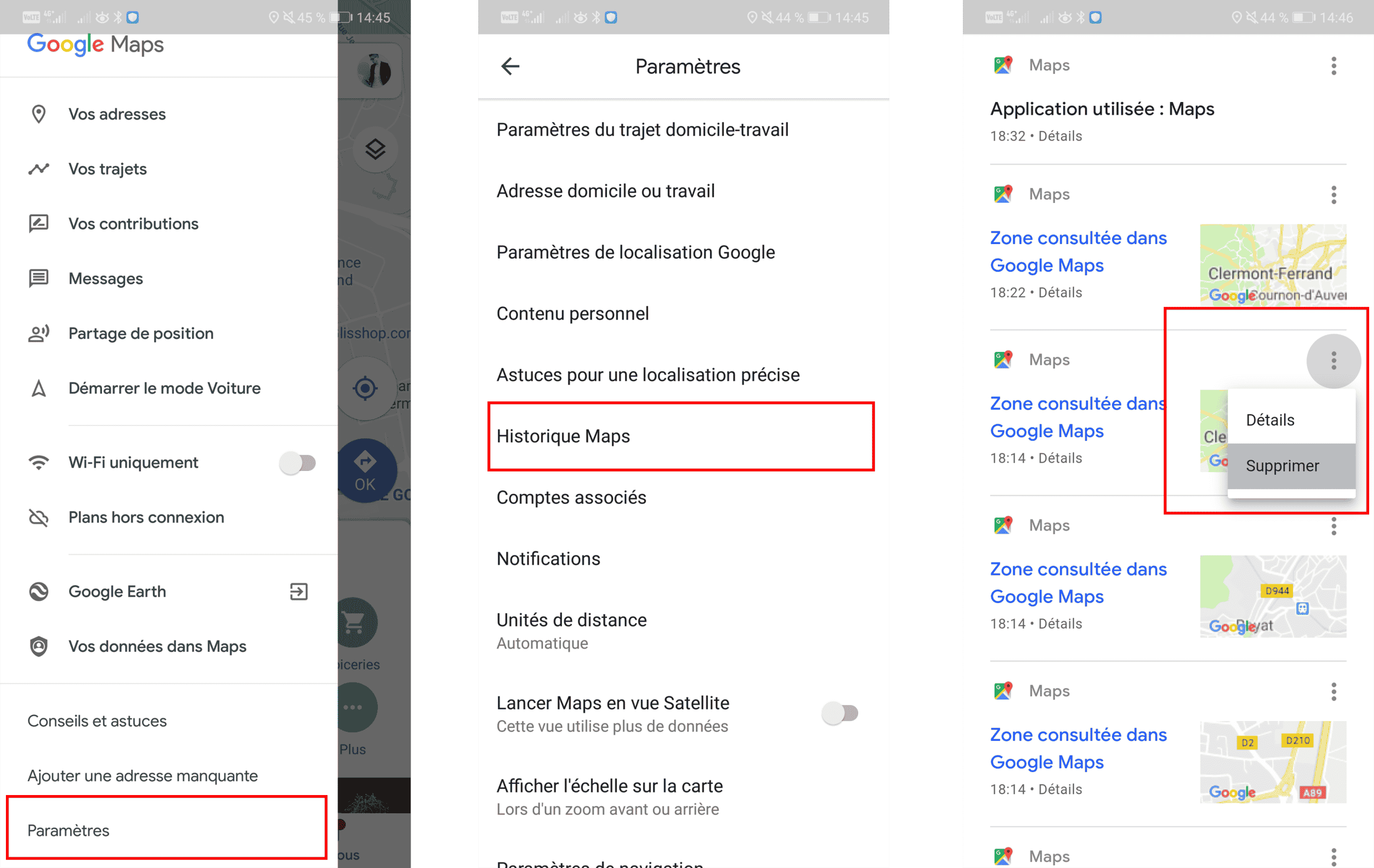 Vous verrez alors s’afficher l’ensemble des recherches et des lieux récemment consultés. Pour chaque adresse ou itinéraire, cliquez sur les trois points alignés en haut à droite de la ligne correspondante, puis choisissez Supprimer.