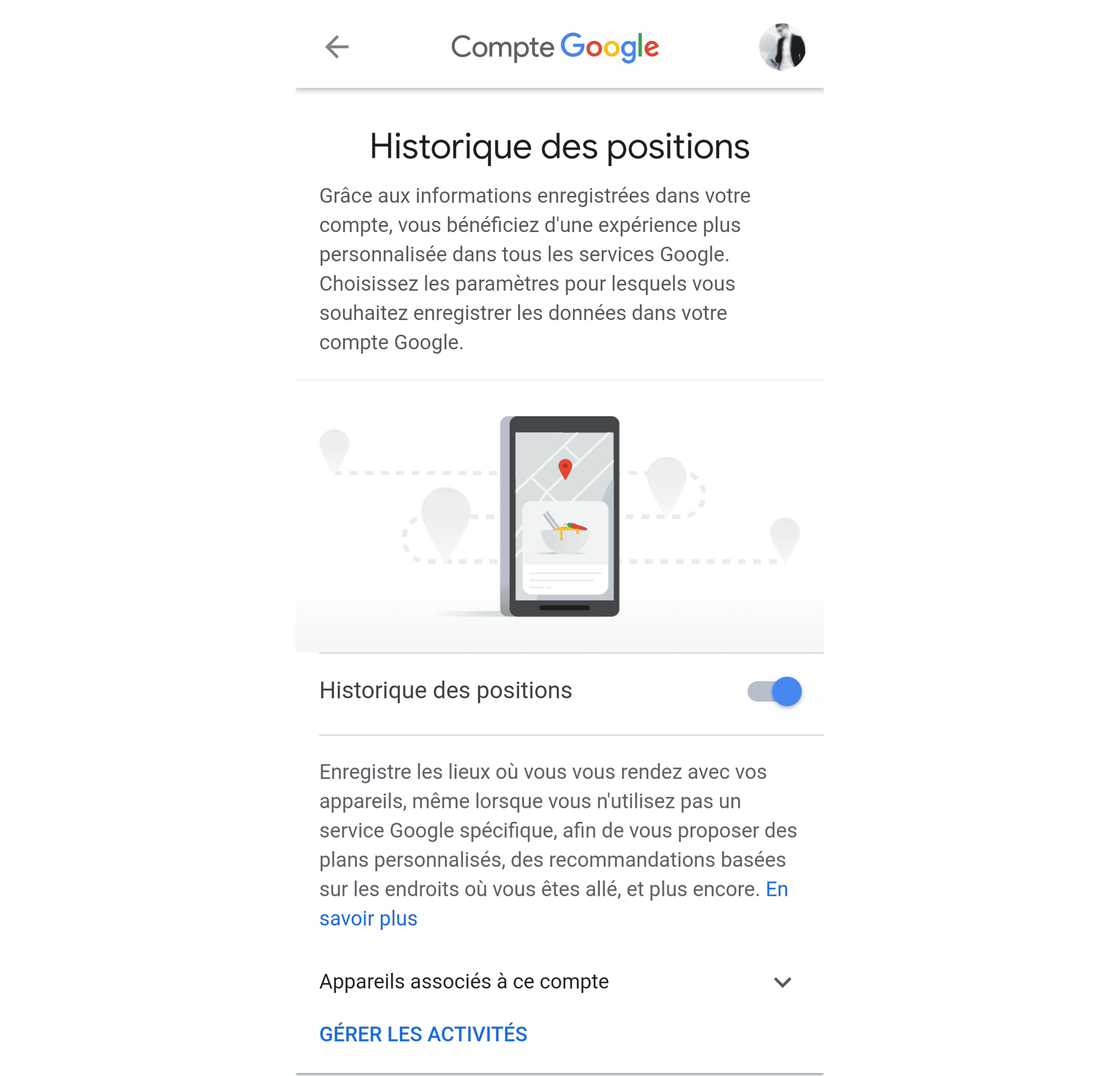 Pour paramétrer cette durée, retournez dans le menu principal de l’application, puis direction Paramètres et Cartes historiques. En haut à droite, cliquez sur le menu symbolisé par trois points, puis sur Gardez l’activité pendant.