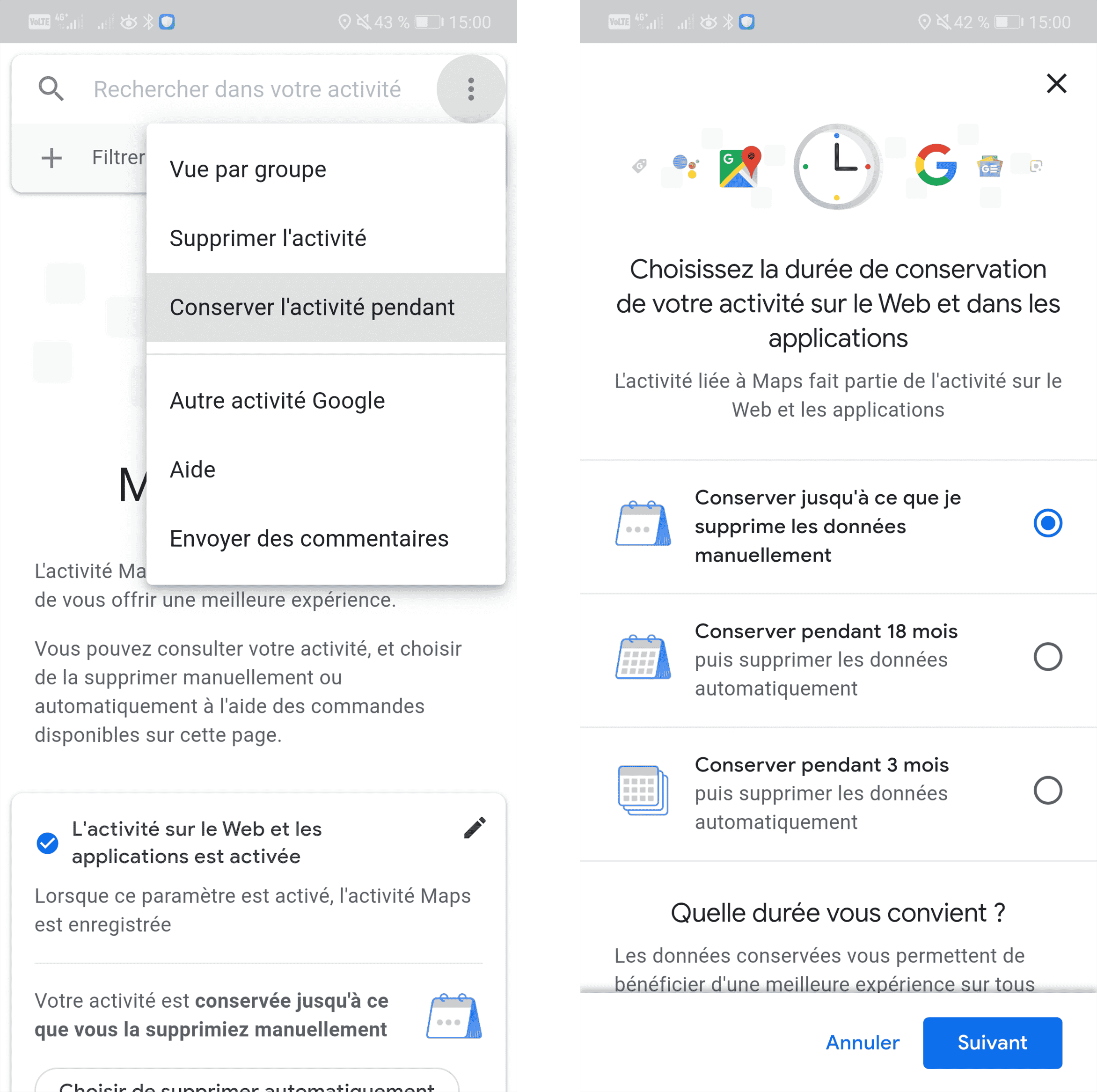 Choisissez la période qui vous convient, 3 ou 18 mois, puis validez en appuyant sur suivant. Dès lors, Google Maps effacera automatiquement les recherches et les localisations qui dépassent ce délai.