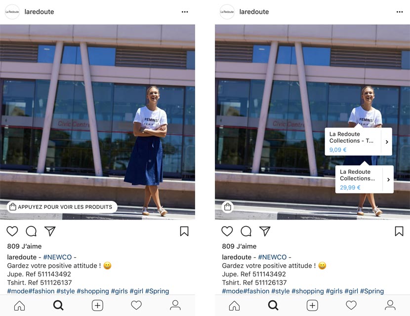 Dès aujourd’hui, tout professionnel disposant d’un compte Instagram peut associer ses produits à ses publications, depuis la plateforme elle-même. Ces étiquettes de produits s’intègrent directement sur les photos, aiguisant la curiosité et facilitant, surtout, l’accès à chaque fiche produit.