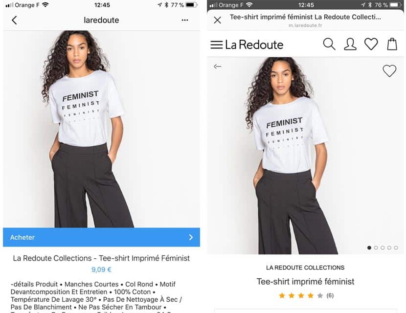 En sélectionnant le bouton « Acheter », la personne est alors redirigée vers la boutique en ligne de la marque. L’acte d’achat se finalise donc hors d’Instagram, directement sur le site du vendeur.